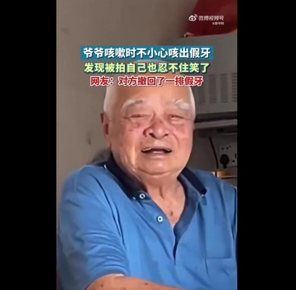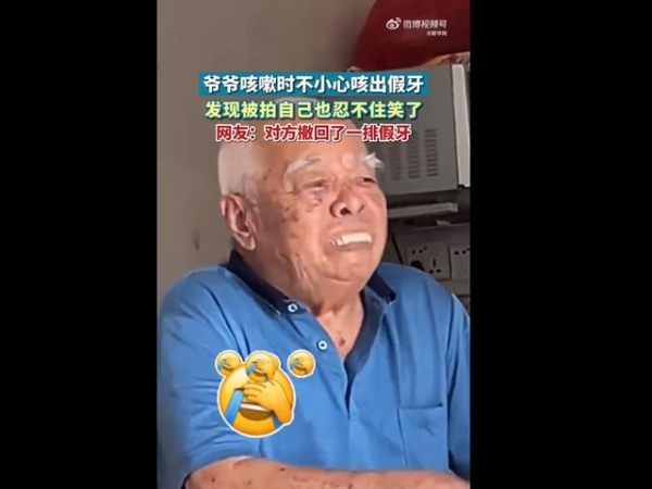 近日,广东。一位爷爷在咳嗽的时候,一不小心把假牙咳了出来,下一秒又迅速撤了回去,发现被拍后,爷爷也忍不住笑了……