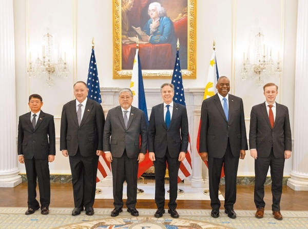 在美日菲三国峰会举行第二天,美国和菲律宾举行3+3会谈,包括国务卿、国防部长和国安顾问与菲律宾对等官员,这也是美菲首次举行外长和防长会谈。美国防长强调,美菲两国两国不仅是盟友还是一家人。同时拜登向菲律宾保证,将履行《美菲共同防御条约》。