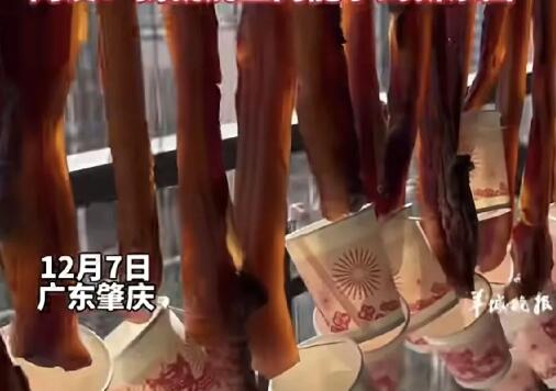 12月7日,广东肇庆。石女士:我晒的是广式腊肠(肉),今年晒了有20多斤。腊肉下面挂杯子是因为家里有小孩子,地板上不方便铺纸皮。这样的话,可以避免腊肉流出来的油,掉到楼下,影响他人。