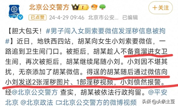 4月29日报道,北京地铁西四站发生了一起令人震惊的事件,一名男子胡某,竟然在地铁站内公然闯入女厕所,向一名女子索要微信,并在得到联系方式后发送淫秽图片和视频。这一行为不仅严重侵犯了女性的隐私权,更是对公共秩序的公然挑战,经过北京公交警方的调查核实,该男子已被依法行政拘留。