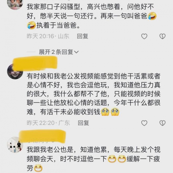 甚至还有网友说,看丈夫笑得那么开心,媳妇一定说了很多让他开心的话。看吧,男人比女人好哄多了,随便几句心疼的话,就让他乐得找不着北。