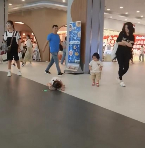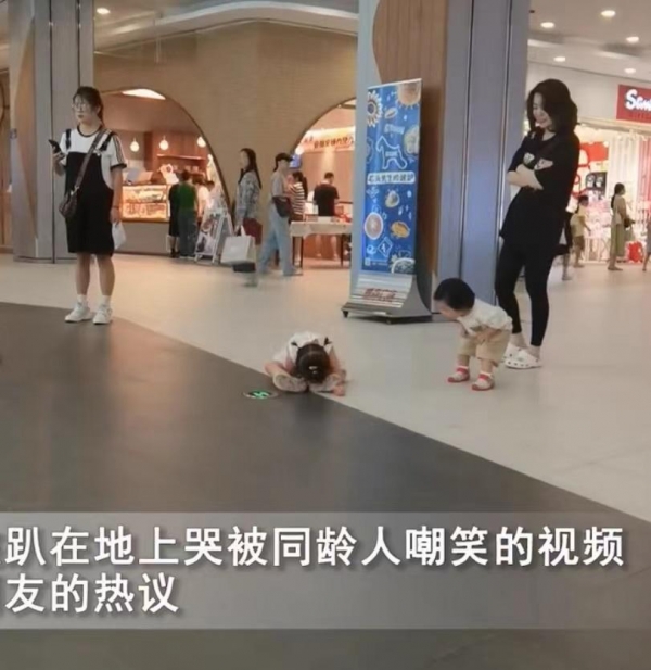 从视频画面中可以看到,两岁女孩趴在地上哭着不肯回家,这时旁边走过来一个一岁左右的宝宝,走路摇摇晃晃的样子,还走不稳呢,宝宝看到小姐姐趴在地上地上哭,上前仔细瞅了瞅,接着用手指着她,发出无情的嘲笑声。