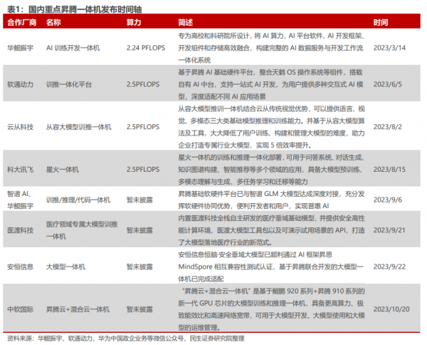 与此同时,民生证券吕伟11月12日研报指出,昇腾AI一体机是国内AI软硬件技术的黄金交点,是以国产算力领军者华为昇腾AI基础软硬件平台为基础,联合国内领先AI厂商打造的先进生产力工具。华为昇腾曾于7月6日在WAIC 2023会上联合科大讯飞、云从科技、智谱AI、面壁智能四家合作发布了昇腾AI大模型训推一体化解决方案。此外国内各厂商陆续发布合作款昇腾一体机,应用范围由科研逐步扩展到AI全场景乃至垂类模型落地。