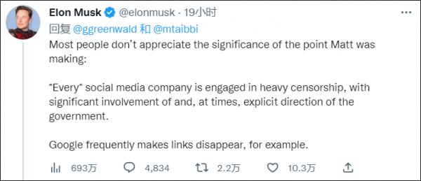 去年12月,刚刚收购美国推特公司不久的马斯克发布推文称,美国所有社交媒体平台都与美国政府机构合作进行内容审查。"每一个社交媒体公司都在政府的大量参与下进行严格的内容审查,有时还会有政府发出的明确指示。例如,谷歌经常让链接页面消失。"