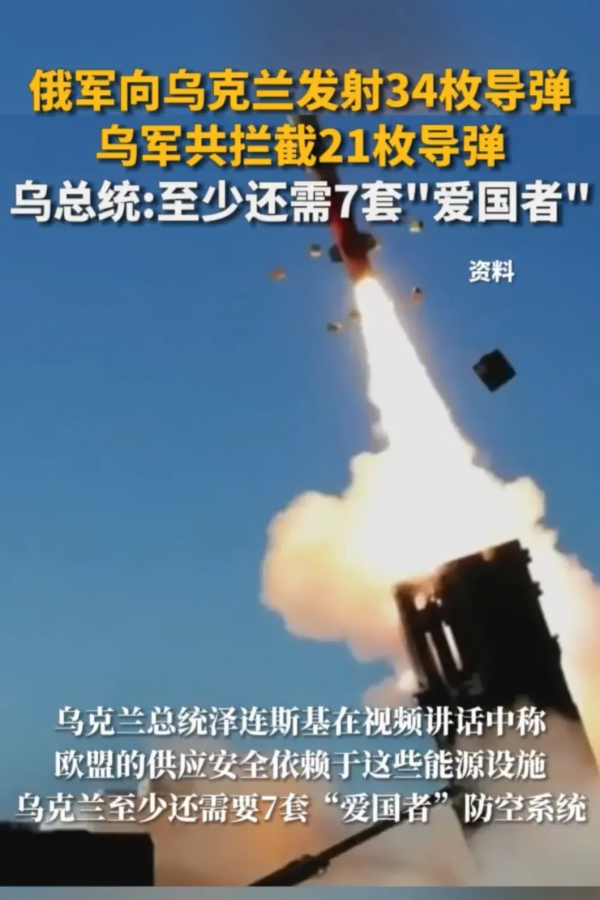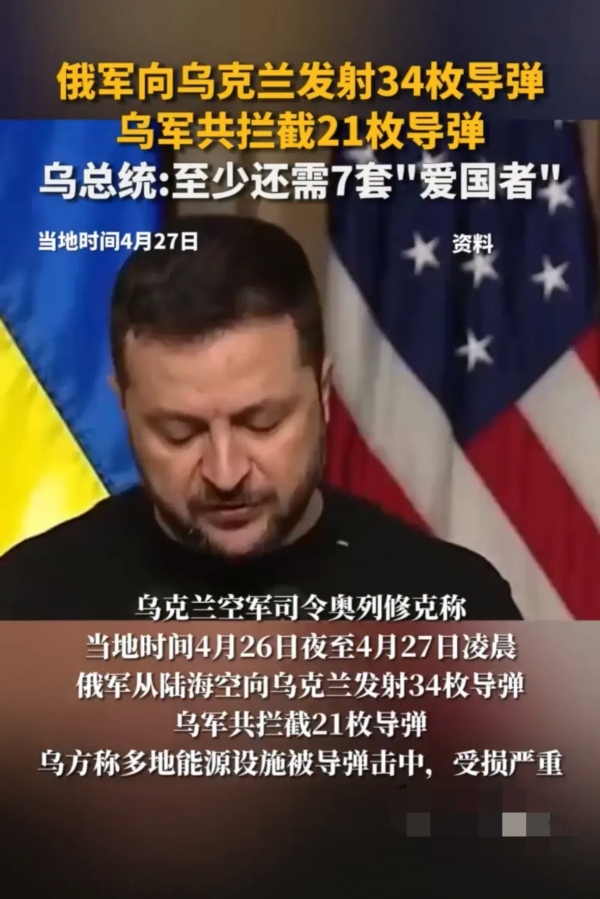 俄乌冲突再起波澜!当地时间4月26日夜至4月27日凌晨,俄军对乌克兰发起大规模导弹袭击,共发射34枚导弹。乌克兰军方紧急拦截21枚导弹,但仍有多地能源设施被击中,受损严重。乌克兰总统泽连斯基紧急呼吁国际社会援助,至少还需7套"爱国者"防空系统以应对未来可能的袭击。