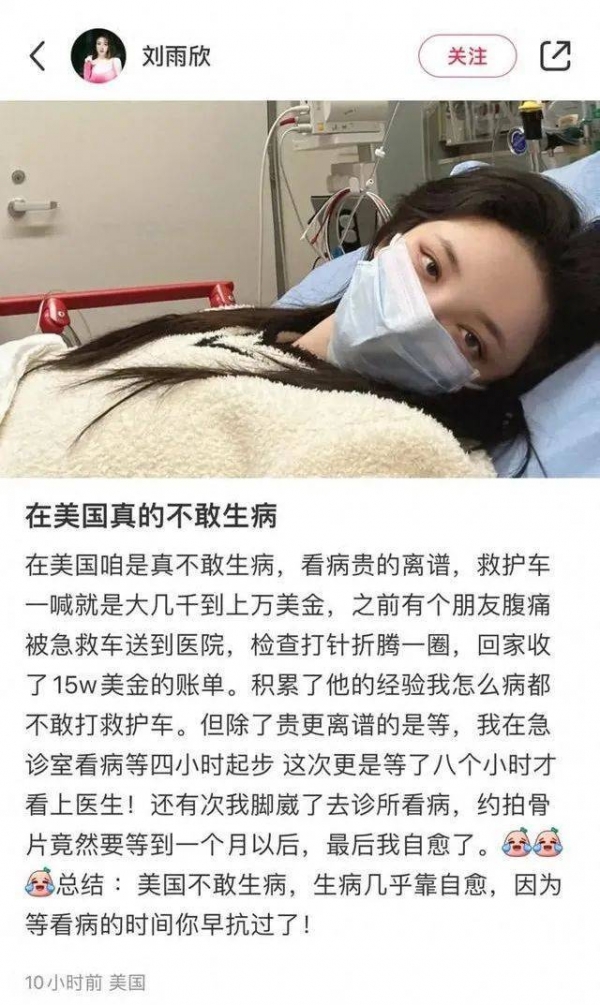 4月9日,演员刘雨欣在社交平台晒出一张戴着口罩躺在病床的照片,配文称:在美国咱是真不敢生病,看病贵的离谱,救护车一喊就是大几千到上万美金,之前有个朋友腹痛被急救车送到医院,检查打针折腾一圈,回家收了15w美金的账单。积累了他的经验我怎么病都不敢打救护车。但除了贵更离谱的是等,我在急诊室看病等四小时起步这次更是等了八个小时才看上医生!还有次我脚崴了去诊所看病,约拍骨片竟然要等到一个月以后,最后我自愈了。总结:美国不敢生病,生病几乎靠自愈,因为等看病的时间你早抗过了!