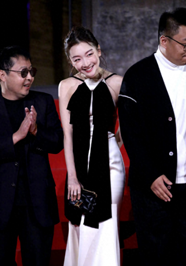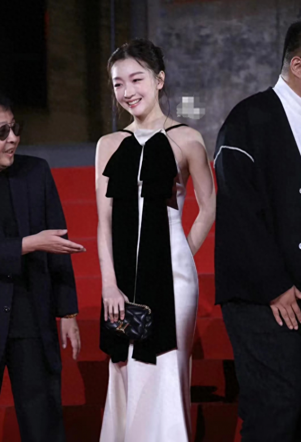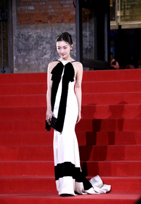 尤其是在设计时,还特意让黑色做了蝴蝶结的样式,不管是胸前的长款飘带,还是裙摆处的小片黑色组合,都可以在视觉上打造出上下呼应的感觉,并且借助直线条试的剪裁,让周冬雨的身材看上去更加的高挑。