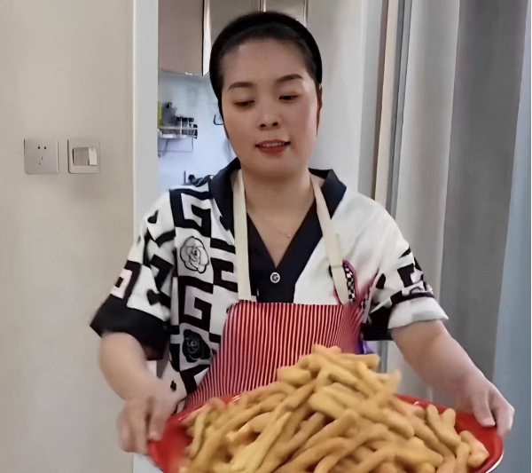 本期素材来源于陕西,一名中年女子,穿着黑白色相间的短袖衬衣,外面搭配红色条纹围裙,她面色红润,面相富态,双手端着一个红色的大托盘,里面堆满了酥脆的茴香小油条。