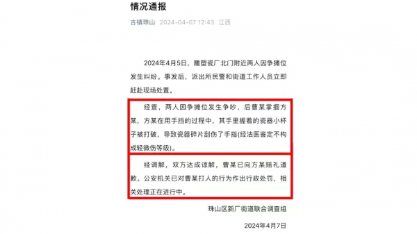 4月7日,当地警方发布通报,称被打女孩的伤势不构成轻微伤,双方已达成和解,老太太赔礼道歉并受到行政处罚。