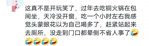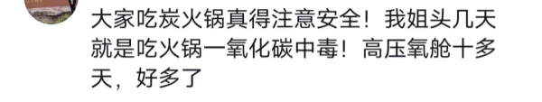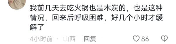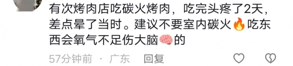 但是也不是绝对的安全,有网友也分享了自己或者身边人都有过在外边吃木炭火锅或者烤肉发生一氧化碳中毒的经历,只是不太严重而已。
