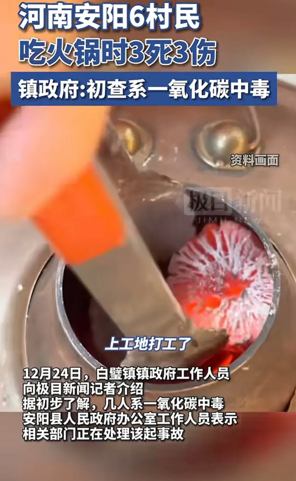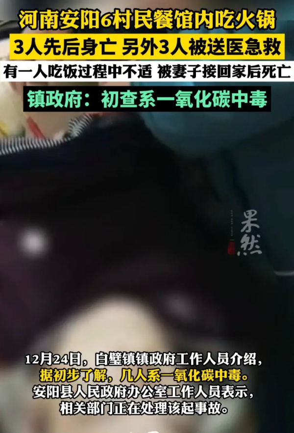 12月24日,网曝河南安阳发生了一起3死3伤的悲剧,6个村民在镇上的一家餐馆吃火锅的过程中发生了一氧化碳中毒,其中一个村民在吃饭过程中感觉不适,被妻子接回家后死亡,一个死在餐馆,还有一个送医后不治身亡,其余三个被紧急送医。