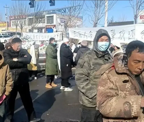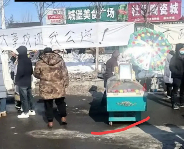 死者家属也在餐馆外边拉了横幅,橫幅上写着"三条人命重大事故,还我公道",除了横幅还摆放了花圈和死者的棺木,周围也围了不少的村民。