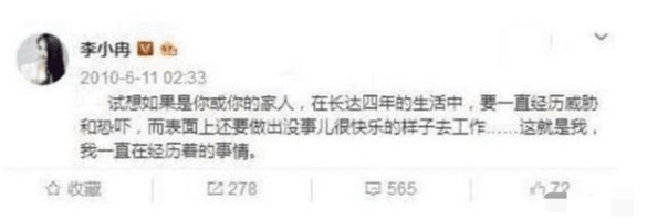 第一位李小冉曾发文描述了一位对她威胁和恐吓四年的男性,甚至连电话和短信都被监控。