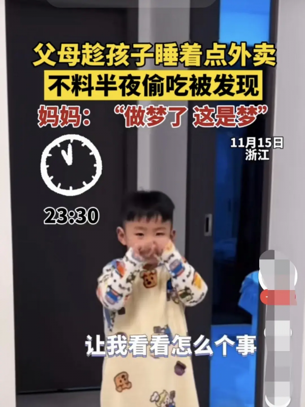 在浙江省某市的一个普通家庭中,一个温馨的夜晚被一场突如其来的亲子互动打破。当晚,夫妻俩看着熟睡的儿子,决定利用这个时间享受一顿宵夜。正当他们坐在餐桌前,品味着美食的时候,儿子突然从梦中惊醒,目睹了这一幕。