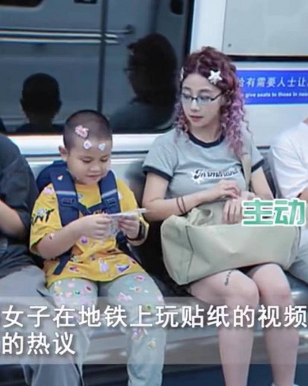 孩子旁边坐着一位年轻的小姐姐,她的打扮十分出彩,蓝色的眼镜,棕红色的波浪卷发,头上还别了两个可爱的海星,膝盖上放着大大的米色背包,相信她走在街上,衣着装扮同样很吸引人。