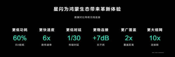 此外,华为还推出NearLink星闪功能。据了解,星闪(NearLink)汇聚了国内外300多家头部企业和机构的集体智慧,用一套标准集合蓝牙和WIFI等传统无线技术的优势,适用于消费电子、智能家居、新能源汽车、工业智造等多种场景为鸿蒙万物互联提供强大连接能力。相比蓝牙技术,功耗降低60%、传输速率提升6倍,具备更低时延、更稳定连接抗干扰能力,覆盖距离提升2倍,连接数提升10倍。