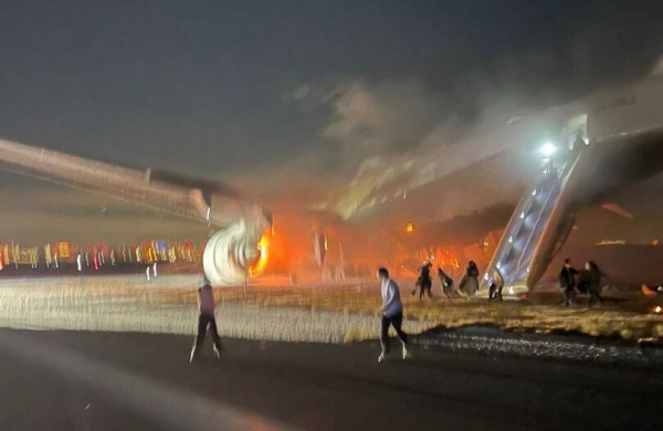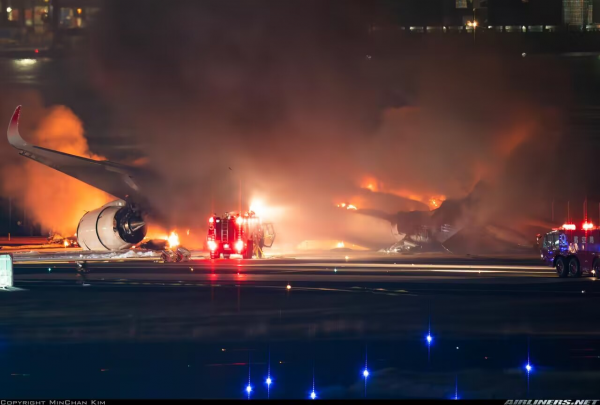 日航516机头着地与地面剧烈摩擦形成大量火光