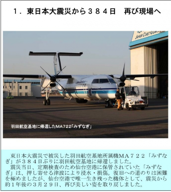这次事故中海上保安厅(以下简称海保)的dash8飞机(MA722)是一架有故事的飞机。在2011年的"3·11"大地震中,这架飞机就在被海啸袭击的仙台机场之中,成为了当时唯一幸存的"泡水机"。这架"3·11"大地震的"幸存者"在经过一年多的修复后重返飞行,而这架飞机如今在又一场大地震后灾区运输物资的任务中发生事故,不由让人感慨造化弄人。