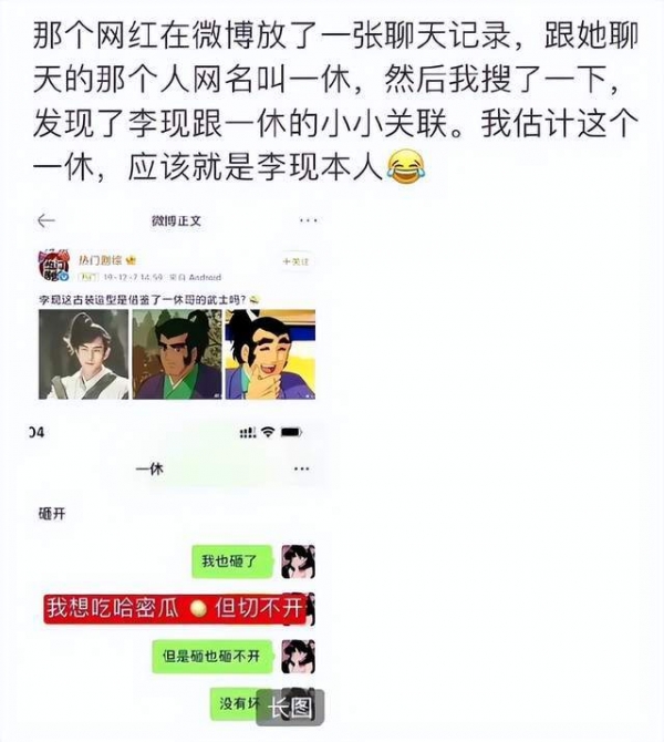 女方也透露过自己的男朋友是湖北人,晒出的聊天截图男朋友网名叫"一休",网友也找到了一休和李现的关联,种种细节让网友猜测这个网红就是李现的女朋友。