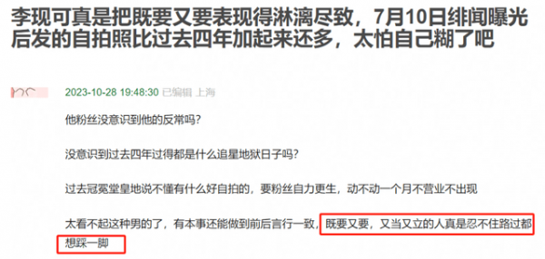 绯闻曝光发酵之后,李现那边却一直没有回应,但明显的是,李现开始频繁营业发自拍,疑似是怕绯闻影响自己的热度,所以营业固粉。但网友也表示,如果真的没有绯闻的话,直接澄清就好了,何必要为了固粉打破常规频繁营业呢?