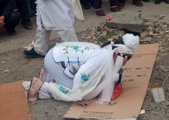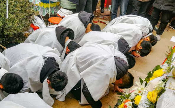 声音响彻了整个丧礼,她一边哭一边给逝者磕头,从开始磕到丧事结束,