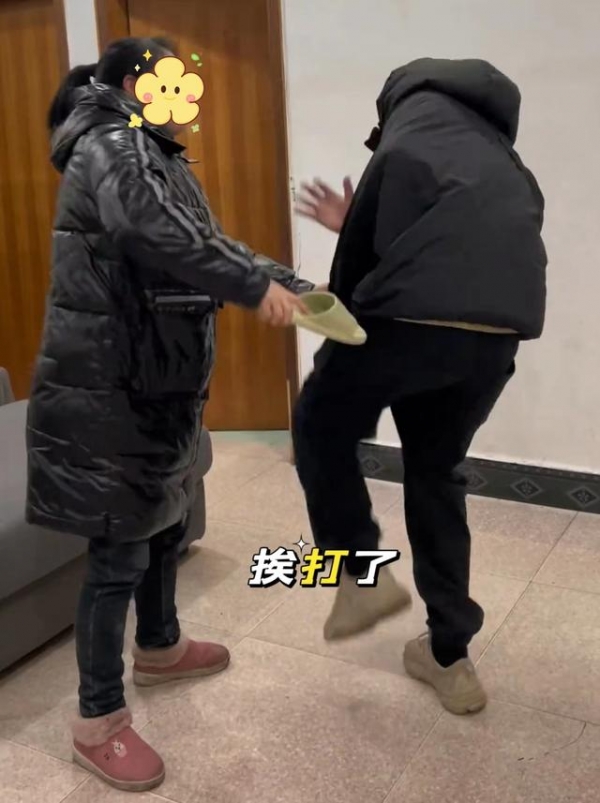 从她分享的镜头中可以看到,一位老人手里拿着拖鞋正对一名拍拍打打,而这名男子面对母亲的攻击丝毫不敢还手,又害怕被拖鞋打疼,只好抬起胳膊勉强抵挡。
