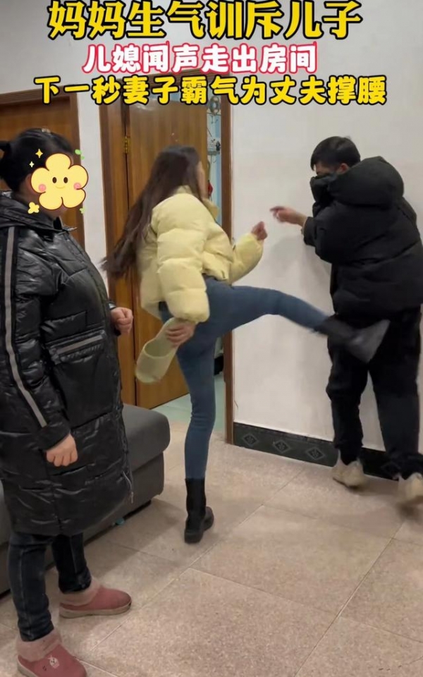 男子一看事情不好,转身就像往卧室跑,又被被妻子飞起一脚踢在屁股上,他只好灰溜溜跑了,留下婆婆一脸得意的笑。