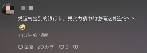 一位网友表示,凭运气捡到的银行卡,凭实力猜中的密码,没想到最后竟然算盗窃。其他人捡到银行卡,无非是交到叔叔那里,或者当做废卡一脚踢开。因为大家都觉得,自己肯定是破译不了密码的,要知道银行卡密码在取款机上只有三次输入的机会,一旦三次全错将被吞卡。