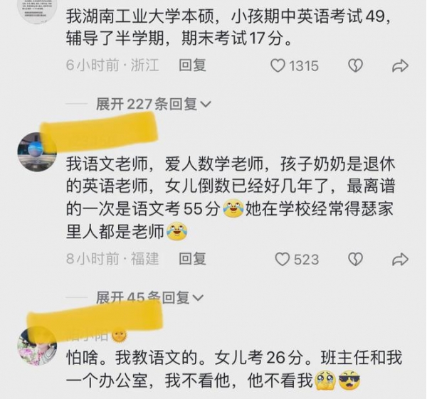 还有网友现身说法,我一个英语老师,带出学校最好的英语班,女儿初三英语只考了30分。五道题目,讲了两个小时还没整明白。以为自己的教育方法出问题了,就连线一个英语培训机构的朋友继续帮着讲。这朋友给我整笑气岔了。他说,哥们,你闺女我实在教不会,你重新找个老师辅导你闺女吧,多少钱我出。那一刻,对闺女好绝望。
