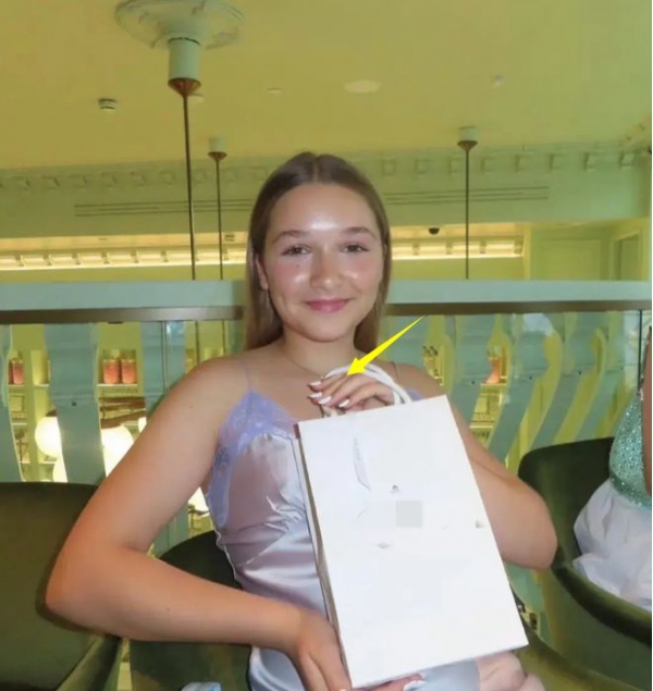 仔细看小七不只穿着蕾丝吊带裙,手上还涂着白色的指甲,打扮得相当成熟。不只如此,她的身高也逼近母亲维多利亚。