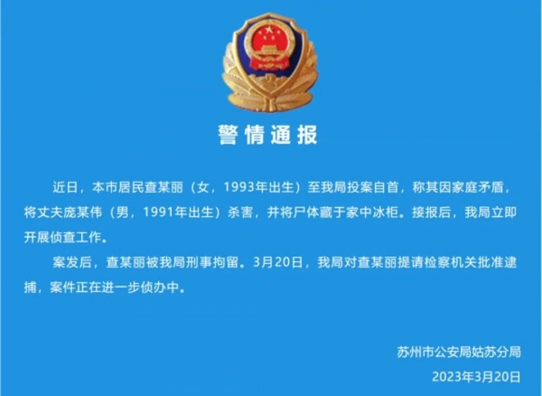 今年3月20日,苏州市公安局姑苏分局发布警情通报:近日,本市居民查某丽(女,1993年出生)至我局投案自首,称其因家庭矛盾,将丈夫庞某伟(男,1991年出生)杀害,并将尸体藏于家中冰柜。案发后,查某丽被警方刑事拘留。3月20日,公安机关对查某丽提请检察机关批准逮捕。