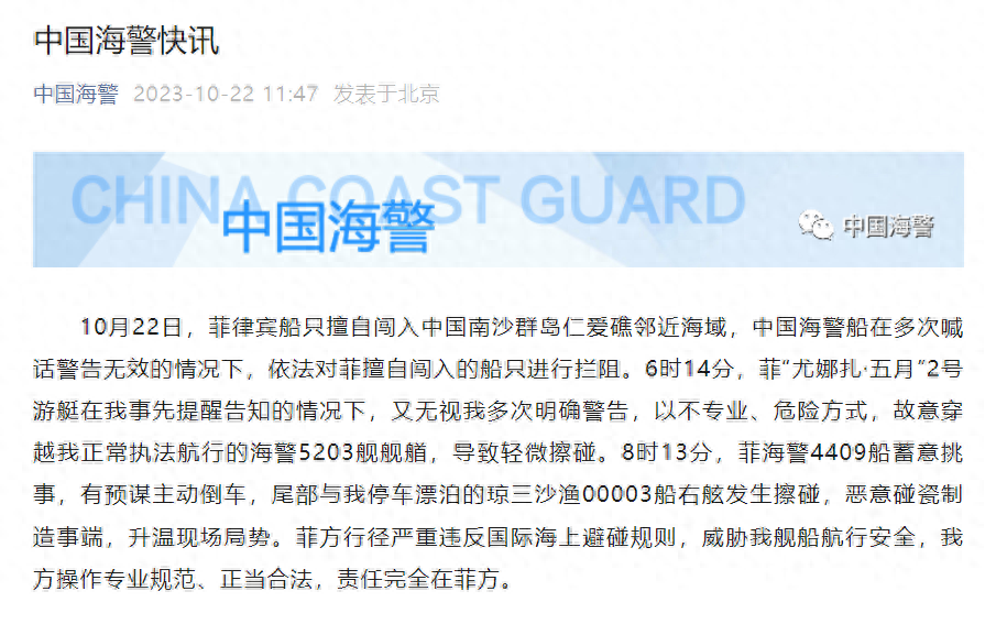根据中国海警局发布的消息,10月22日,菲律宾船只擅自闯入中国南沙群岛仁爱礁邻近海域,中国海警船在多次喊话警告无效的情况下,依法对菲擅自闯入的船只进行拦阻。6时14分,菲"尤娜扎·五月"2号游艇在我事先提醒告知的情况下,又无视我多次明确警告,以不专业、危险方式,故意穿越我正常执法航行的海警5203舰舰艏,导致轻微擦碰。8时13分,菲海警4409船蓄意挑事,有预谋主动倒车,尾部与我停车漂泊的琼三沙渔00003船右舷发生擦碰,恶意碰瓷制造事端,升温现场局势。