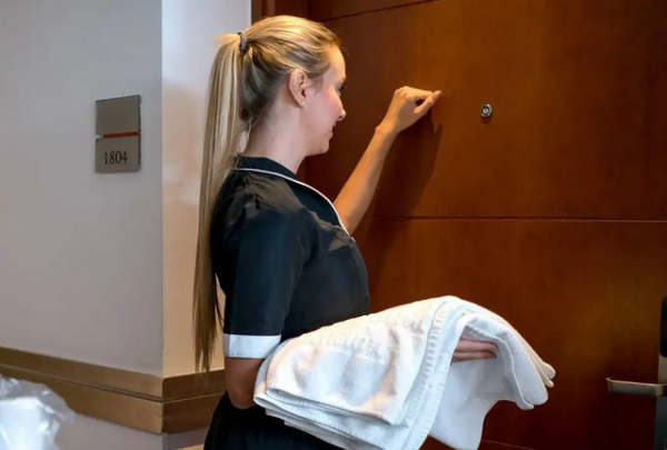 她不耐烦的用一口流利的英文回复:"我不需要客房服务。"但门外的敲门声却没有停下来,反而变得更加紧急了,她以为服务员有什么急事找自己,便穿上睡袍不耐烦的前去开门。