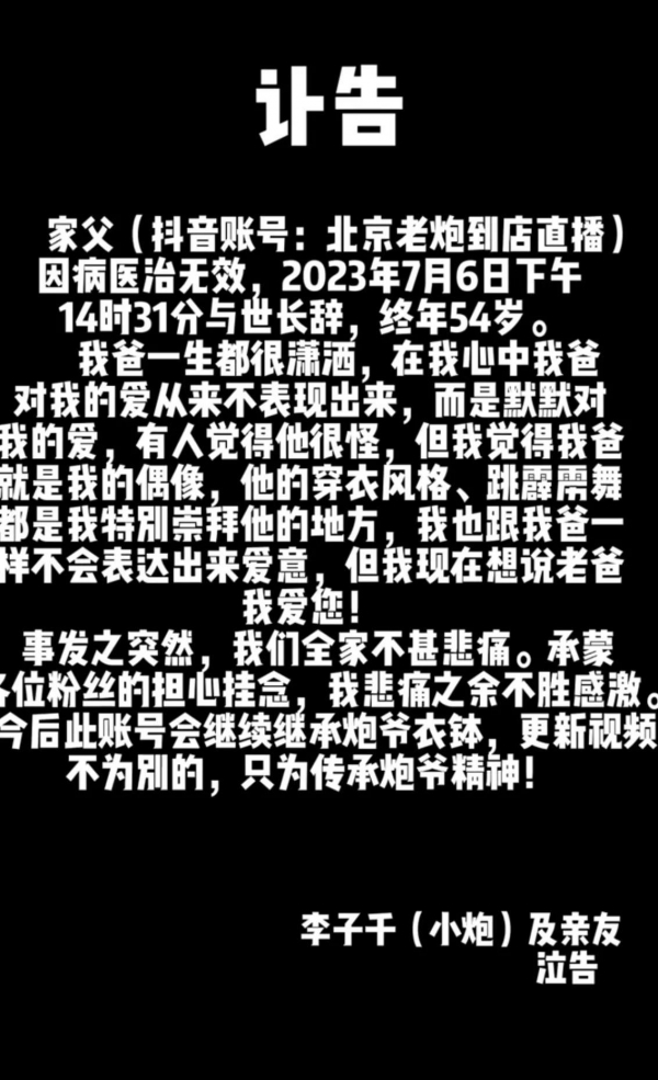 他的儿子李子千含泪发出讣告,因为事发突然,全家人都感到悲痛不已,李子千更是透露自己平时不善表达,甚至都没来得及和父亲说一声"我爱您",这也成了他最大的遗憾。