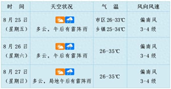 8月25日05时到28日08时:多云有雷阵雨,偏南风5级,雷雨时阵风7-8级。
