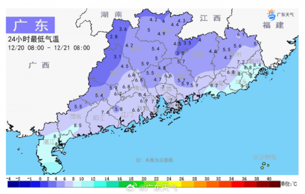 据@广东天气 消息受冷空气+辐射降温影响,广东最低气温持续走低,今天早晨最低气温0℃线压到粤北到珠三角北部(高寒山区-6℃~-1℃),5℃线至广东中南部,有大范围低温、冰(霜)冻,昨晚20时到今早8时广东全省21地市最低气温均在10℃以下。