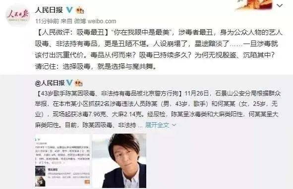 陈羽凡在2018年被曝出吸毒,被人民日报点名批评。
