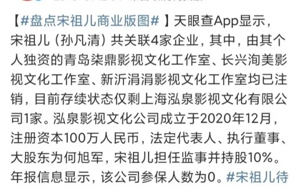 网友晒出她的商业版图,发现她名下关联企业居然只有一家,而且股份只占百分之十,说明她在为自己留后路。另一方面,这个爆料发酵开始已经24小时,官方通报都没出来,她身上又有很多待播剧,背后涉及资本很多,所以被保下来也有可能。