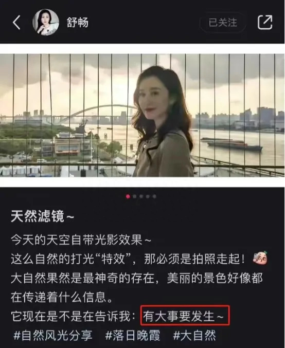 这一背刺行为让网友心疼舒畅,所以在宋祖儿出事后,舒畅发了一条动态,晒出了一张风景照片,说超美丽的景色好像传递着什么信息,它现在是不是告诉我有大事要发生。