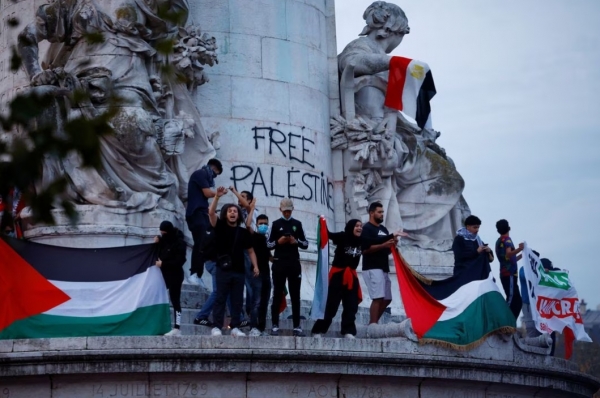 示威者在巴黎市中心举行支持巴勒斯坦的示威游行,图自外媒