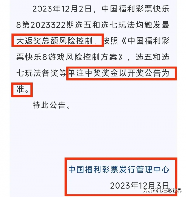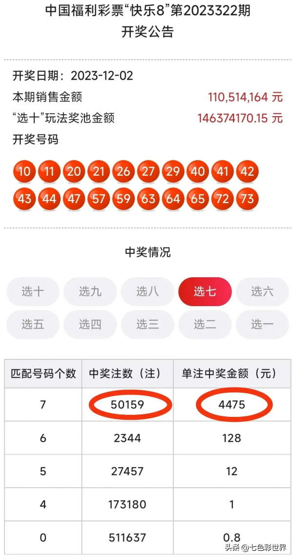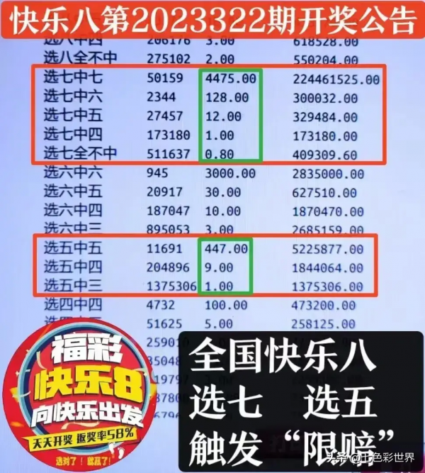 快乐8第2023322期选五和选七玩法均触发最大返奖总额风险控制按照《中国福利彩票快乐8游戏风险控制方案》,选五和选七玩法各奖等单注中奖奖金以开奖公告为准。