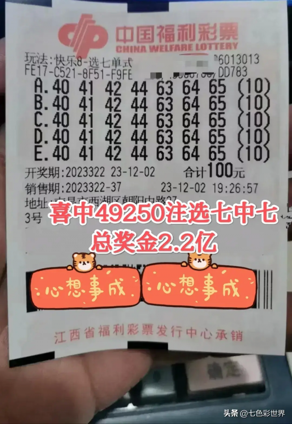 继体彩大乐透前不久爆出1.24亿元巨奖后,国内彩市再添一个超级大奖:在12月2日晚福彩"快乐8"第23322期开奖中,江西南昌某彩民独中49250注"选七中七",合计总奖金高达2.2亿元!