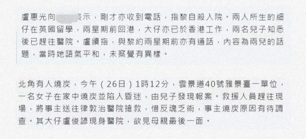 另外,卢惠光表示接到前妻自杀入选的通知,才知道黎淑贤去世的消息,媒体报道,事主在家中烧炭的原因还有待调查,现场没有发现遗书!