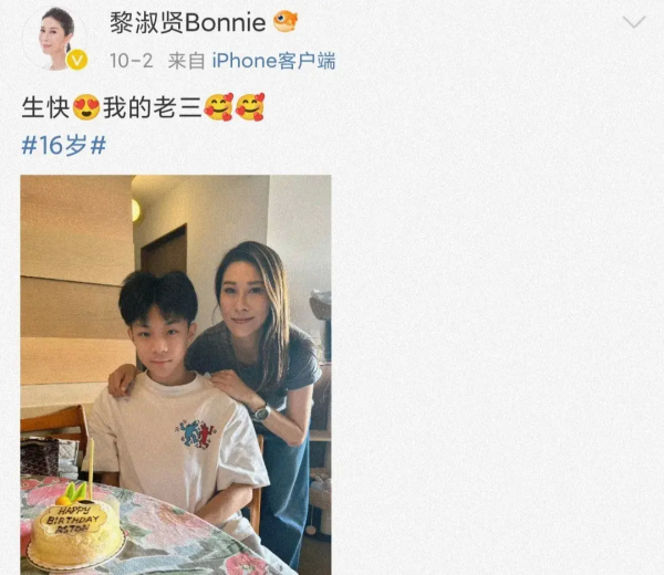10月份,黎淑贤在社交平台发文,为儿子庆祝16岁生日,并晒出一张合影。
