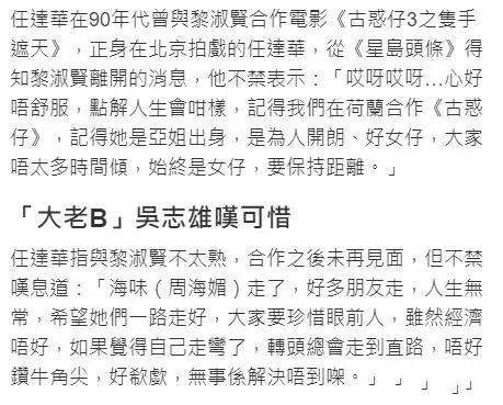 获悉黎淑贤去世的消息,曾经一起合作过的演员任达华通过媒体表达悼念,坦言心里非常不舒服。