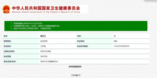 有关于张江的身份,顶端新闻记者通过国家卫健委信息查询中了解到,张江确为一名执业医师,主要执业平台为邳州市中医院。在某第三方平台的信息中,标注张江是邳州市中医院麻醉科主治医师。但黄先生称,张江目前已不在中医院任职。