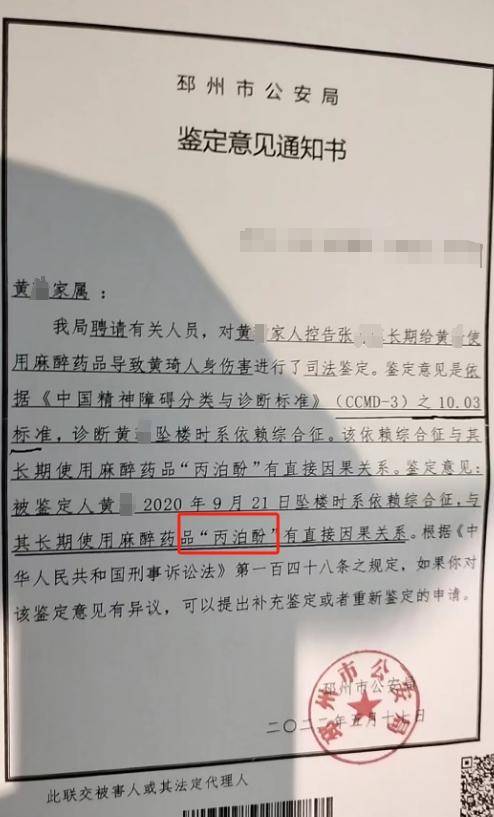 根据邳州市公安局2022年5月给出的一份《鉴定意见通知书》,该局聘请有关人员对黄芹家人控告张江长期给黄芹使用麻醉药品导致黄芹人身伤害进行了司法鉴定。鉴定表明黄芹坠楼时系依赖综合征,该依赖综合征与其长期使用麻醉药品"丙泊酚"有直接关系。最终,鉴定意见为:被鉴定人黄芹2020年9月坠楼时系依赖综合征,与其长期使用麻醉药品"丙泊酚"有直接因果关系。
