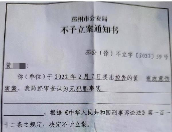 但在今年5月,邳州市公安局就黄先生控告黄芹被故意伤害案,经邳州市公安局审查认为,无犯罪事实,决定不予立案。