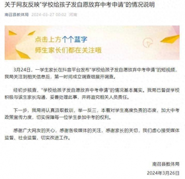经初步核查,"学校给孩子发自愿放弃中考申请"的情况基本属实。该局已督促学校积极与该生家长沟通,妥善处理此事,并将追究相关人员责任。
