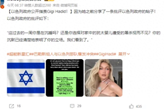 据凤凰网娱乐报道,10月17日,以色列公开威胁美国超级女模吉吉·哈迪德,指责其支持巴勒斯坦的言论,称"你的沉默已经非常清楚地表明了你的立场,我们看到你了",这似乎是对这位美国超级女模的赤裸裸威胁。